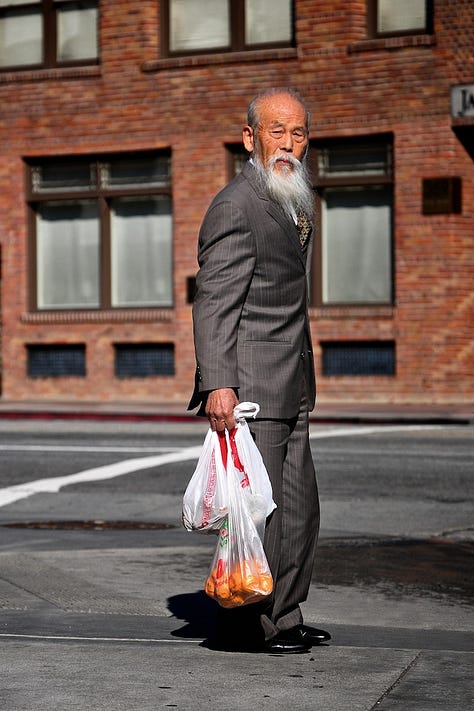 Old Man in a Suit, Little Tokyo — I lived in Rancho Cucamonga, California for about 15 years and one of the things I used to love doing was taking the train into Los Angeles Union Station and walking down Alameda to Little Tokyo for lunch, followed by a stop at one of my favorite sweets shops for a couple pieces of daifuku. On one visit, I was sitting at the fountain after lunch and saw this man as he was leaving the Nijiya Market and was just struck by his appearance — the way the sun caught his beautiful suit, his long gray beard, and the deep lines of character in his face. I followed him for about two blocks and when we were both waiting for a light to change, he looked over at me and I held up my camera and gestured “is this okay?” The light changed, but he nodded and paused just long enough for me to get off two frames before he stepped into the crosswalk. The composition here is pretty basic — I think what makes this picture is the expression on his face. I still love this picture.