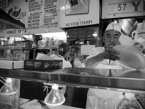 Lunchtime Touch Up — This photo was taken inside Grand Central Market in Downtown LA. The market is on Broadway with Angels Flight on one side and the iconic Bradbury Building on the other. I used to go to this particular stall fairly regularly because they had some of the best tacos in LA. I think it was on this visit that I met up with Ibarionex Perello for lunch before spending some time wandering around LA talking and taking photos. This is another photo where I think the composition just works. It looks much more compelling in black and white than it did in color, and I love that I managed to catch the woman fixing her lipstick in the mirror.